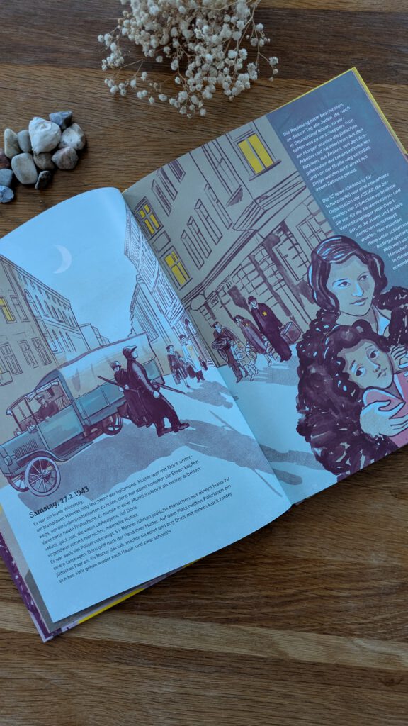 Hier lesen wir die Geschichte der kleinen Doris. Schon im Jahr 1941 merkt Doris, dass sich viele geändert ist. Weil ihr Vater Jude ist, darf sie nicht mehr auf dem Spielplatz spielen und auch vieles mehr ist mittlerweile für Juden verboten. Sie dürfen nur noch wenige Lebensmittel kaufen und nur eine spezielle Schule besuchen. Auf dem Schulweg werden sie oft von nicht – jüdischen Kindern schikaniert und in der Schule verschwinden nach und nach mehr Kinder, die es geschafft haben, noch aus Deutschland auszureisen. Andere sollen Richtung Osten fortgebracht worden sein, sagt man.