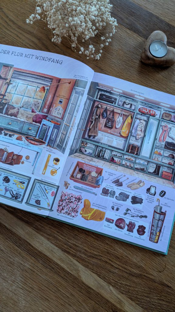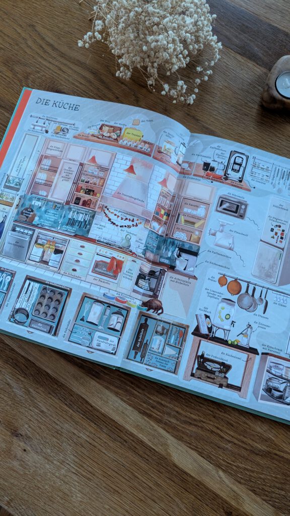 Noch viel mehr liegt in der Speisekammer, in der es auch viel zu entdecken gibt. Natürlich schauen wir auch noch in viele andere Räume. Es gibt ein Ess- und Wohnzimmer, ein Schlafzimmer für die Eltern, in dem auch ein großer Schminktisch steht und das Kinderzimmer von Anna und Konrad, in dem es doch mehr Durcheinander gibt als in den anderen Räumen. Insgesamt gibt es 14 verschiedene wimmelige Doppelseiten, auf denen alle Elemente mit Namen beschriftet sind. Mit diesem sehr ästhetischen Wimmelbuch können die Kinder viel Zeit verbringen!