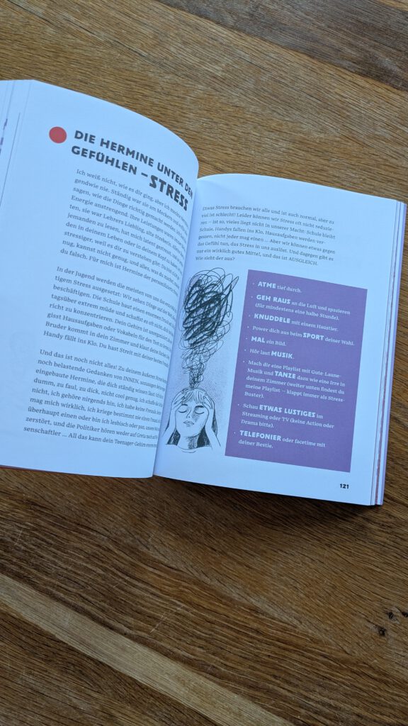 Mit viel aktuellem Fachwissen schreibt sie über körperliche Veränderungen, Menstruation und Verhütung. Ganz wunderbar ist, dass darüber hinaus aber auch noch Themen wie Mental Health und Body Positivity in den Blick genommen werden. Mit eher kurz gehaltenen Sachtexten, vielen einzelnen Abschnitten und ausdrucksstarken Illustrationen in lila-rot Tönen von Anna Gusella lässt sich es sich auch dann sehr gut lesen, wenn man sonst nicht so gerne zu Sachbüchern greift.