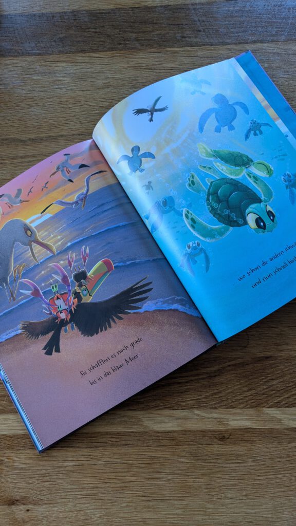 Marlas Mut hat alle beeindruckt und nun möchten sie ihr helfen. Gemeinsam bringen sie die beiden in Sicherheit und hin zum Meer, in das sie nun endlich eintauchen können. Die Schildkröte hat durch ihr Handeln gezeigt, wie wichtig es ist, sich um einander zu kümmern und auch mal vom Weg abzubiegen, wenn es nötig ist.