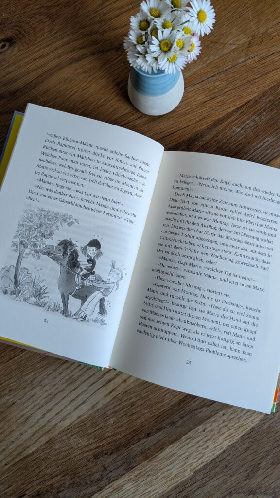 Dem Mädchen fallen aber sieben T- Shirts ins Auge, auf denen jeweils ein anderer Wochentag zu lesen ist. Irgendwas gibt ihr das Gefühl, dass sie diese dringend braucht. Am nächsten Montag zieht sie also voller Freude das „Montag“ Shirt an, das sich dabei ganz besonders kribbelig anfühlt. Bei Spielen und Streiten mit ihrem kleinen Bruder wird dieses nass und dreckig und sie muss sich umziehen. Kaum hat sie das „Dienstag“ Shirt über den Kopf gezogen, fühlt sich alles auf einmal anders an. Sie steht nicht mehr im Kinderzimmer, sondern befindet sich zusammen mit Mama auf dem Pferdehof – wie jeden Dienstag. Wie kann das sein?