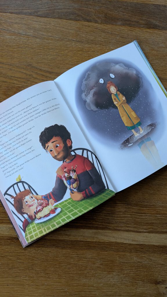Papa erklärt, dass es für sie nun ist, als hänge eine graue Wolke über ihr, die ganz viel Kraft kostet und sie oft zum Weinen bringt. Diese graue Wolke, die bei Mama Vieles so anders gemacht hat, wird wohl noch eine Weile bleiben. Das sei der Unterschied zu kleinen Sorgen – Wolken, die wir alle immer mal kennen. Als es Mama am nächsten Tag noch nicht einmal schafft, aufzustehen und mit zu, Kindergarten zu kommen, ist Jona selbst auch ganz schön traurig.