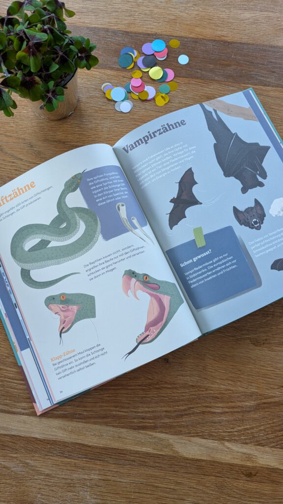 [unbezahlte Werbung Rezensionsexemplar] Ich liebe Kindersachbücher zu ganz besonderen oder speziellen Themen. „Von Goldzahn bis Giftzahn. Packende Fakten mit Biss“ von Yoann Cantin und Maria Marega ist so eines! Nachdem es vor allem für die Kleinen viele Kinderbücher zum Thema „Zähne Putzen“ gibt, es das Buch hier nun voll mit Informationen zu unseren Zähnen (und Zähnen aus der Tierwelt), zu zahnärztlichen Behandlungen und einigem mehr. Das ist sehr anschaulich, unterhaltsam und informativ gemacht und passt für Kinder ab ca. 6 Jahren.
