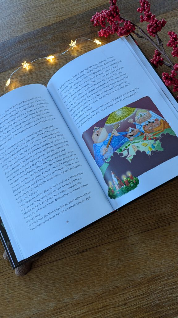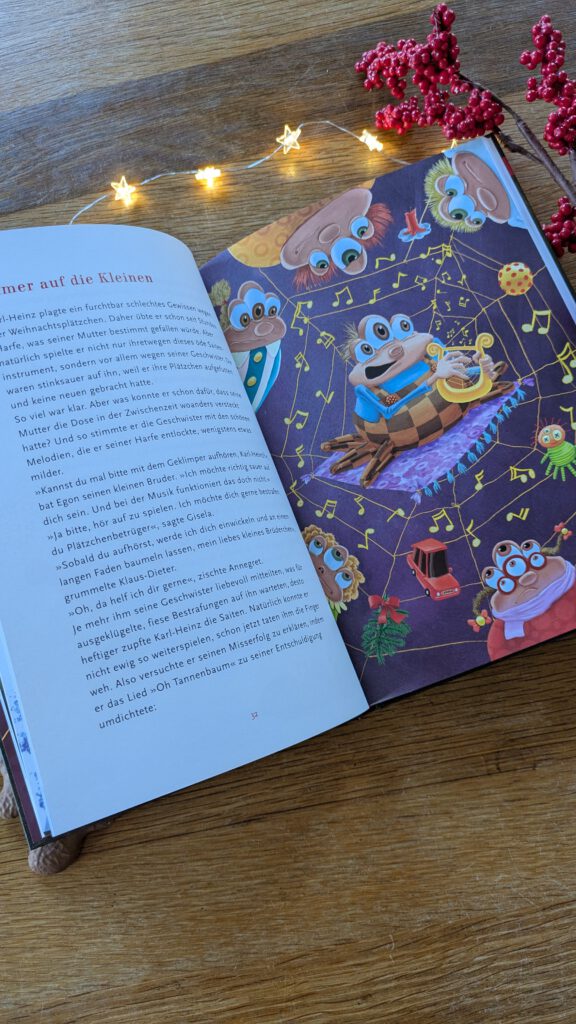 [unbezahlte Werbung/Rezensionsexemplar] Kennt ihr die Geschichten rund um die Kreuzspinne Karl – Heinz und die Stubenfliege Bisy? Mit schrägem Humor und witzigen Illustrationen begeistern die Geschichten schon lange kleine und große Leser:innen ab 5 Jahren. Nun ist mit „Weihnachtsspinnerei“ der neunte Band der Reihe von Kai Pannen erschienen. Hier ist das Besondere, dass wir in die sehr unterschiedliche Kindheit der beiden schauen und beide Familien in den Tagen vor Weihnachten begleiten. Hier einmal der Hinweis: wenn die Kinder noch fest an den Weihnachtsmann/das Christkind glauben, passt das Buch wahrscheinlich nicht so ganz für euch.
