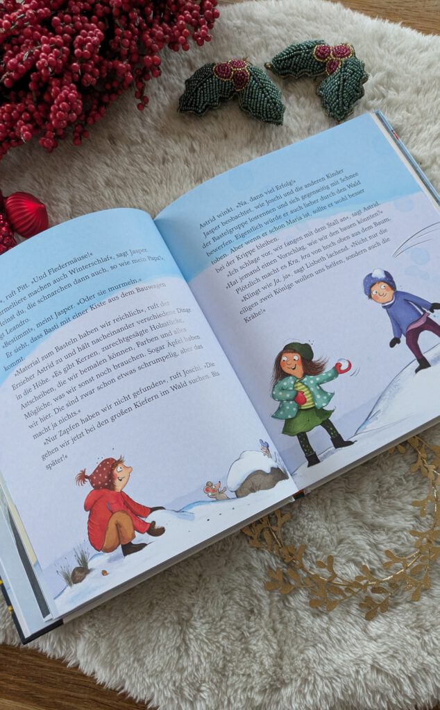 Es macht Spaß, die Kinder bei ihrem Kindergartenalltag zu begleiten. Wir lesen nicht nur über die Vorbereitungen für das Krippenspiel, sondern auch über alltägliche Dinge im Waldkindergarten. Die beiden Geschwister sind ganz unterschiedliche „Typen“, die eine sehr selbstbewusst, eher laut und mitteilsam. Der andere ruhiger und sensibler. Aber trotzdem traut er sich die Rolle der Maria zu und meistert am Ende alles wunderbar.