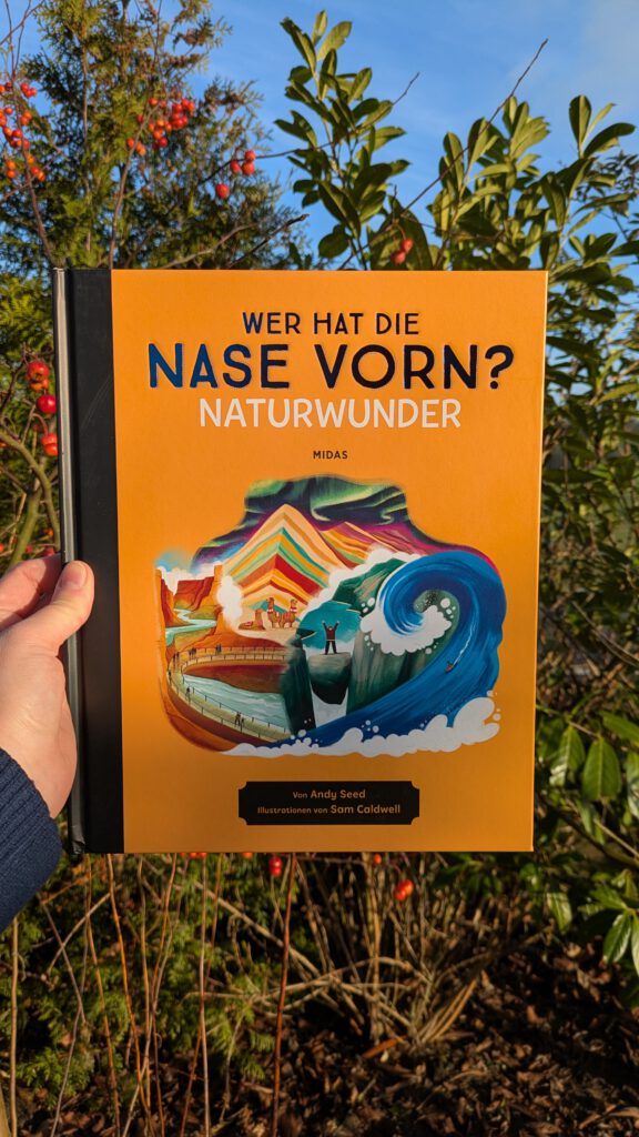 „Wer hat die Nase vorn? Naturwunder“ von Andy Seed und Sam Caldwell gehört zu der Kindersachbuch – Kategorie! Mit kindgerechten und amüsanten Illustrationen und einer besonderen Kombination aus Witz und Wissen macht es einfach Spaß, hier ganz viel zu entdecken. Wir schauen hier auf hohe Berge, tiefe Seen, Flüsse, Wasserfälle und und Vulkane auf der ganzen Welt. Das passt für Kinder ab 8 Jahren.