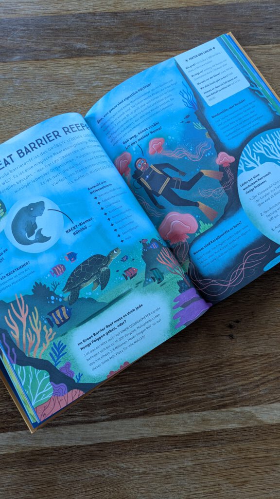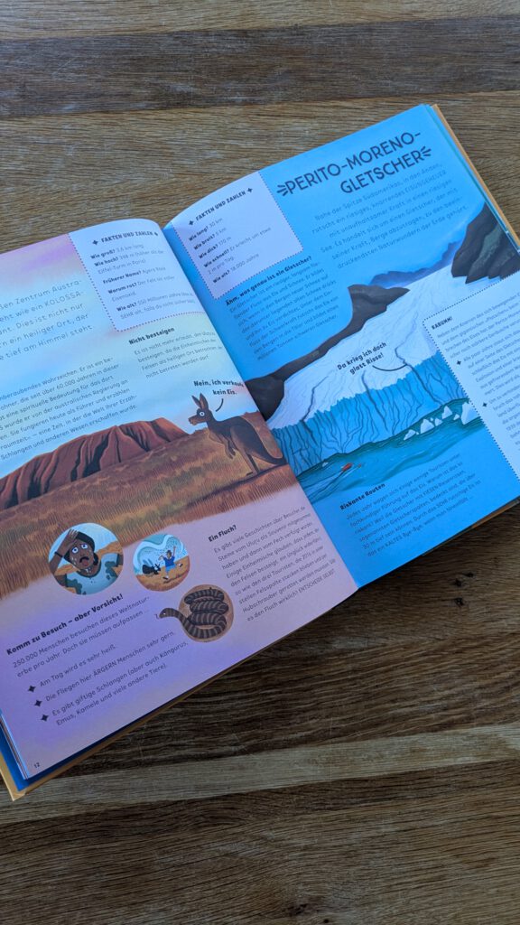 Zum Endes des Buches hin wird es „vielfältig und endlos“. Wir staunen über die Tier- und Pflanzenwelt des Amazonas Regenwaldes, lernen eine Salzwüste kennen und bereisen einen Regenbogenberg in Peru. Das Buch passt für alle, die mal in verschiedene Themenbereiche hineinschnupper wollen – und das mit einer guten Prise Humor. Wir bekommen keine ganz tiefer gehenden Informationen, sondern einen sehr interessanten Überblick über viele Orte und Naturphänomene. Auf jeden Fall eine schöne Geschenkidee.