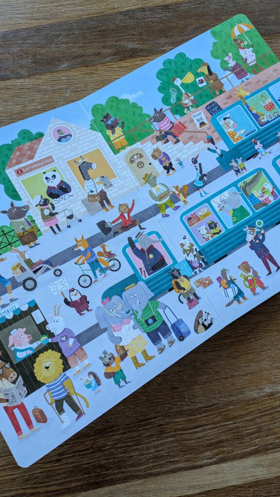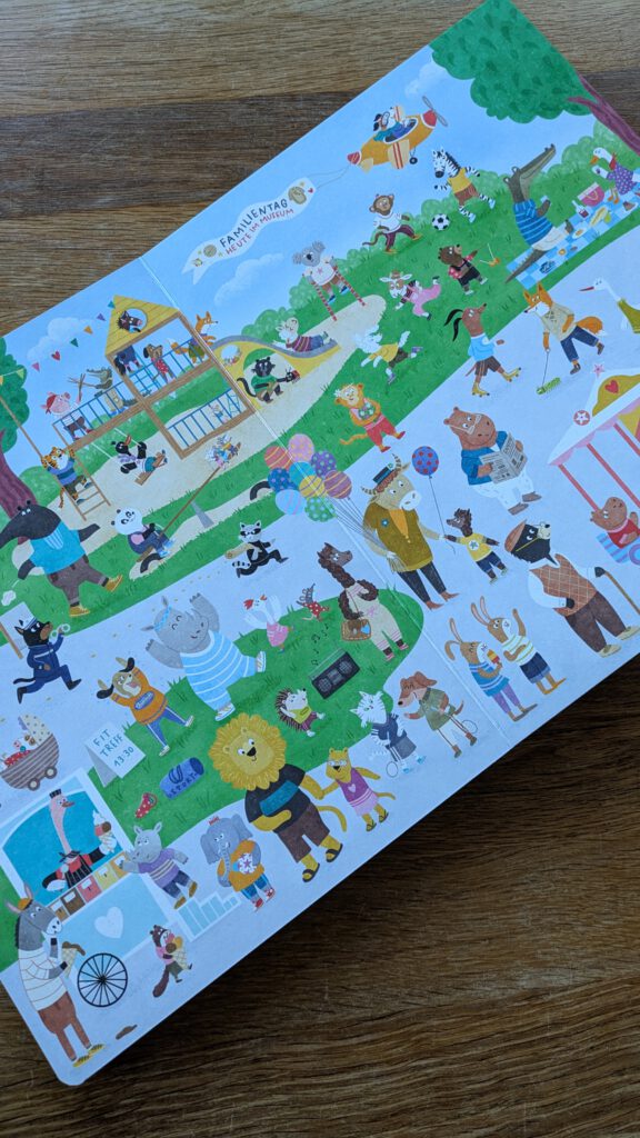 Es gibt noch vier weitere Doppelseiten mit unterschiedlichen Szenen. Wir schauen im Park vorbei, in dem es einen Kinderspielplatz gibt, besuchen eine Baustelle und genießen mit den Tieren das besondere Flair an der Straße am Hafen. Auf der letzten Seite ist es Abend geworden. Manche Tiere bereiten sich auf die Nachtruhe vor, andere sind noch unterwegs und feiern. In den verschiedenen Szenen gibt es eine ganze Menge zu entdecken.