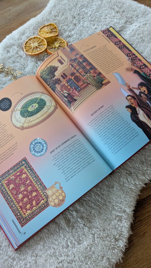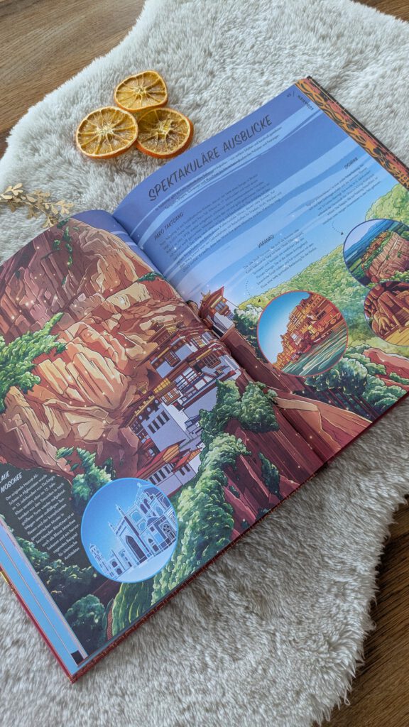 Es gibt so viel Fantastisches zu entdecken. Die Auswahl der Informationen ist überaus vielfältig. Historisches wechselt sich ab mit aktuellen politischen Geschehnissen, Interessantes über Kunst und Kultur mit Sachwissen über regionale Gerichte und Architektur. Ganz besonders gut gefallen mir die Doppelseiten mit den „Spektakulären Aussichten“, bei denen wir mit beeindruckenden Illustrationen auf ein