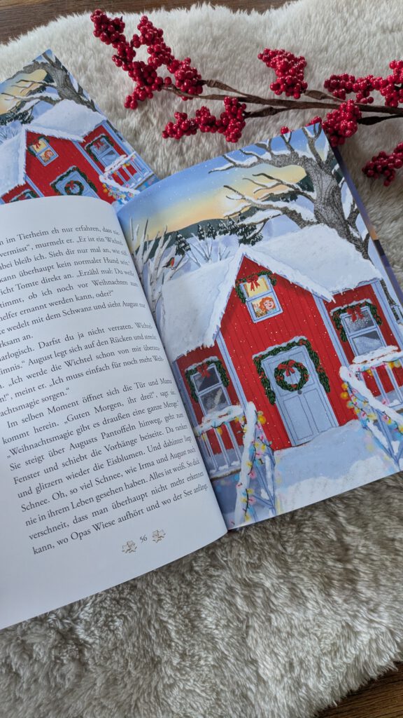 Es passiert natürlich noch eine ganze Menge mehr! August versucht bei jeder Gelegenheit, für magische Weihnachtsmomente zu sorgen, Irma und der Rest der Familie wundert sich, warum ständig Zimtsterne verschwinden und Opa scheint auf einmal ständig niesen zu müssen! Nach dem Basar erwartet sie auf Opas Veranda die nächste Überraschung: ein kleiner Hund, der scheinbar niemandem gehört! Und das, wo ein eigener Hund an erster Stelle von Irmas Wunschzettel steht!